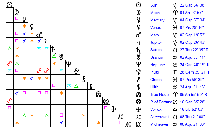 | Sun | 22 Capricorn 56 | 23 Capricorn 46 | 14 Taurus 34 |