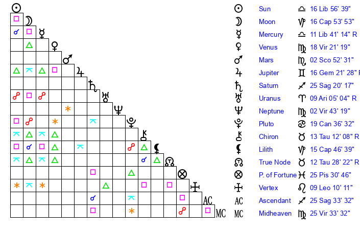 | Moon | 16 Capricorn 58 | 7 Gemini 39 | 21 Cancer 17 |