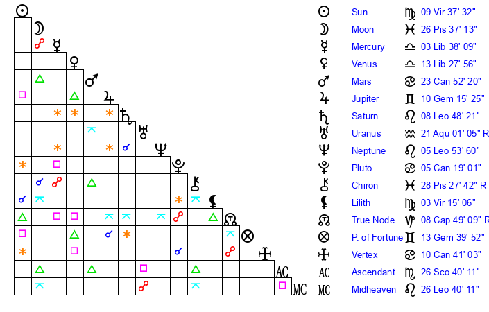 | Sun | 9 Virgo 37 | 10 Virgo 28 | 27 Sagittarius 15 |