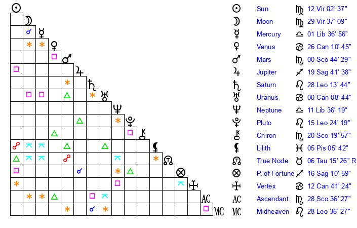 | Moon | 29 Virgo 31 | 3 Aquarius 31 | 16 Cancer 51 |