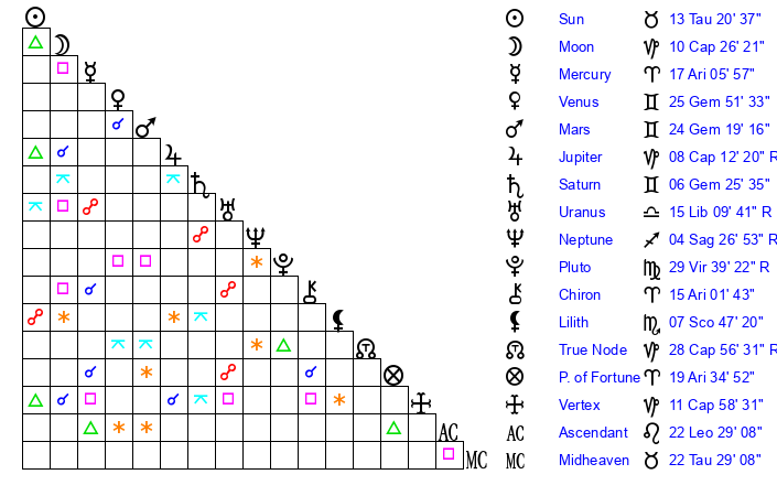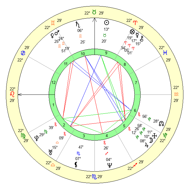 | Venus | 25 Gemini 51 | 1 Aries 45 | 21 Gemini 46 |