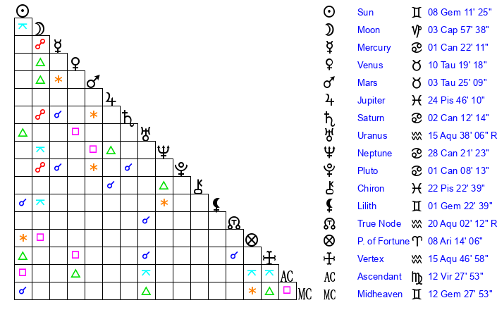 | Sun | 8 Gemini 11 | 9 Gemini 32 | 23 Virgo 42 |