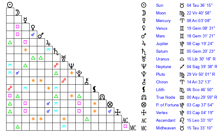 | Moon | 22 Virgo 36 | 21 Pisces 16 | 3 Virgo 17 |