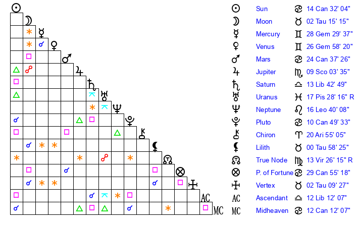 | Sun | 14 Cancer 32 | 15 Cancer 50 | 23 Libra 18 |
