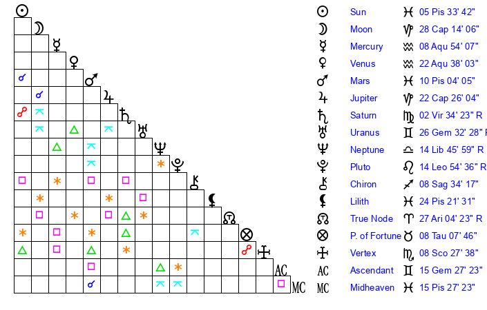 | Sun | 5 Pisces 33 | 6 Pisces 8 | 20 Taurus 27 |
