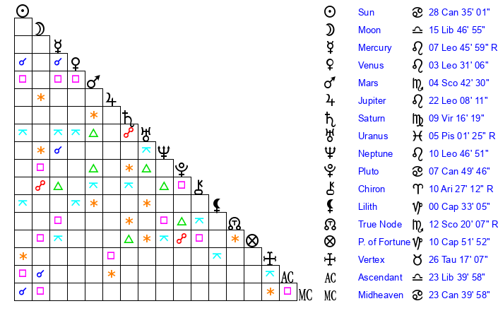 | Moon | 15 Libra 58 | 18 Gemini 17 | 15 Leo 57 |