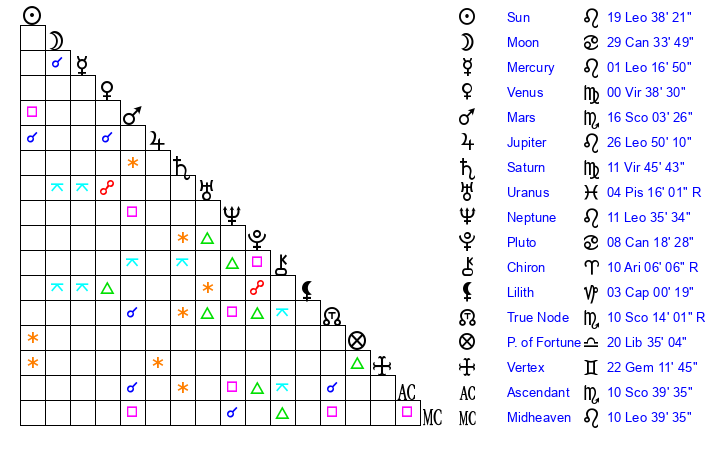 | Venus | 0 Virgo 39 | 14 Cancer 37 | 9 Capricorn 43 |