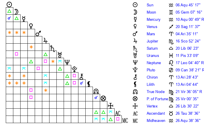| Sun | 6 Aquarius 45 | 8 Aquarius 1 | 18 Taurus 2 |
