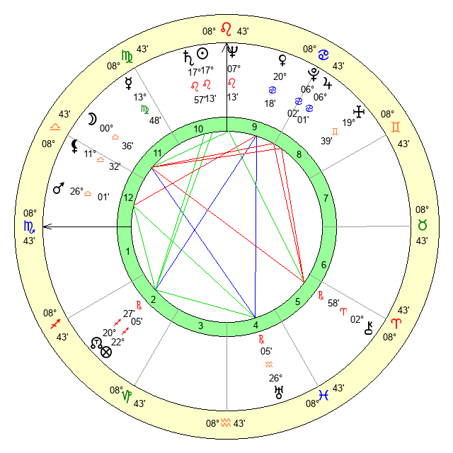 | Moon | 0 Libra 41 | 5 Pisces 50 | 5 Virgo 46 |