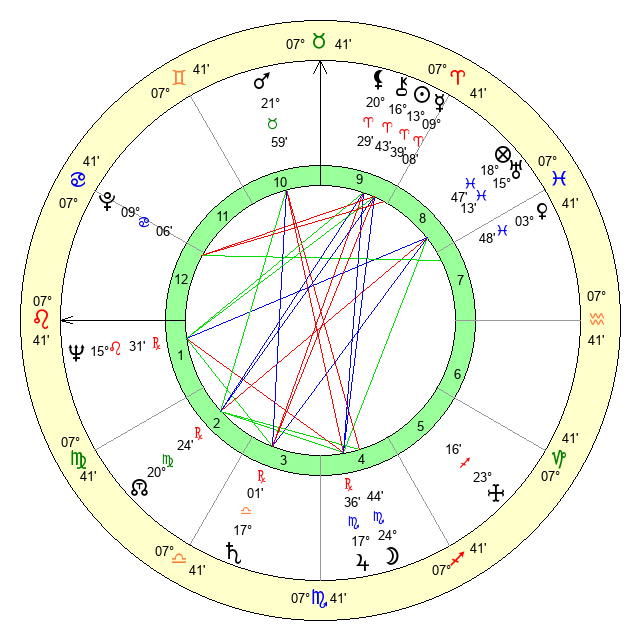 | Moon | 24 Scorpio 43 | 7 Cancer 2 | 9 Leo 38 |