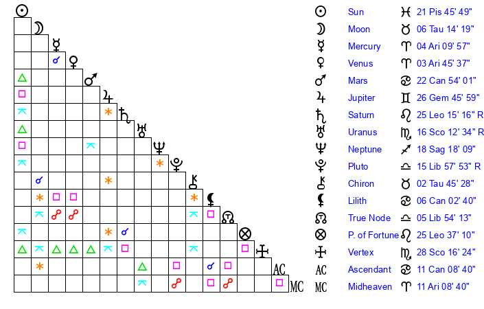 | Sun | 21 Pisces 46 | 22 Pisces 22 | 8 Taurus 3 |
