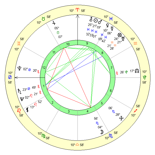 | Sun | 21 Pisces 33 | 22 Pisces 22 | 6 Cancer 23 |