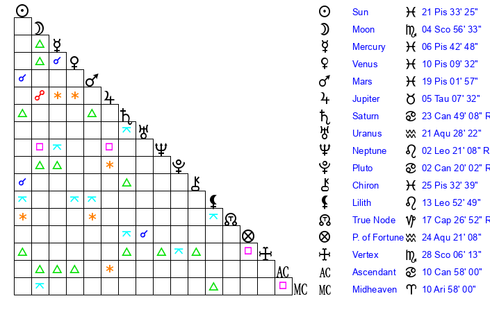 | Sun | 21 Pisces 33 | 22 Pisces 22 | 6 Cancer 23 |