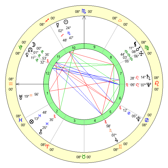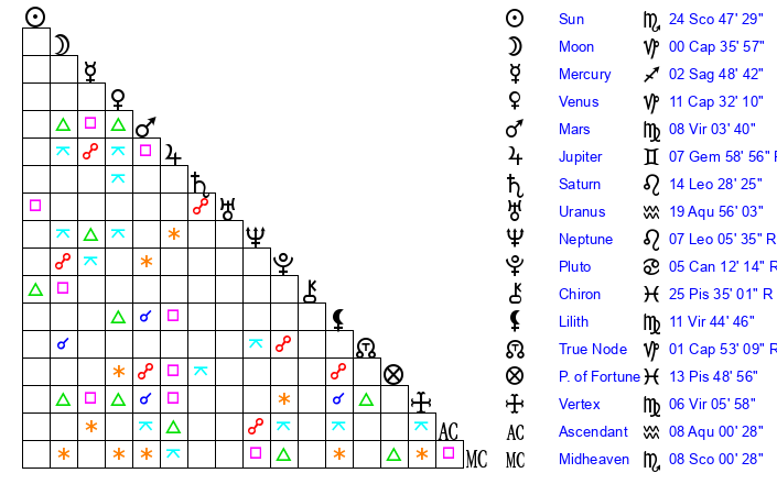 | Sun | 24 Scorpio 47 | 25 Scorpio 36 | 14 Pisces 19 |