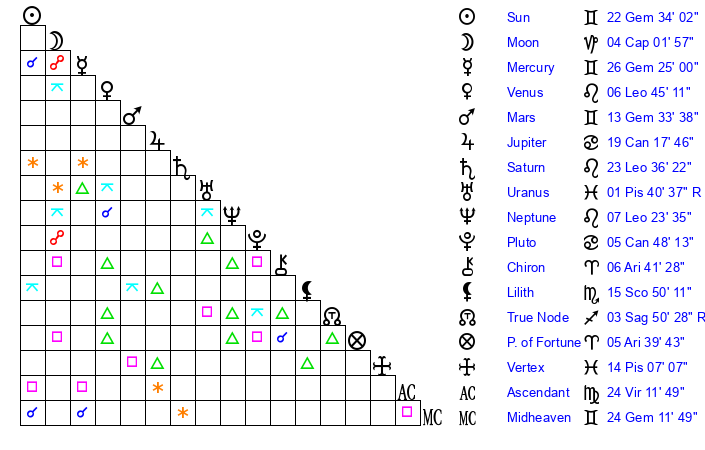 | Sun | 22 Gemini 34 | 23 Gemini 53 | 4 Libra 30 |