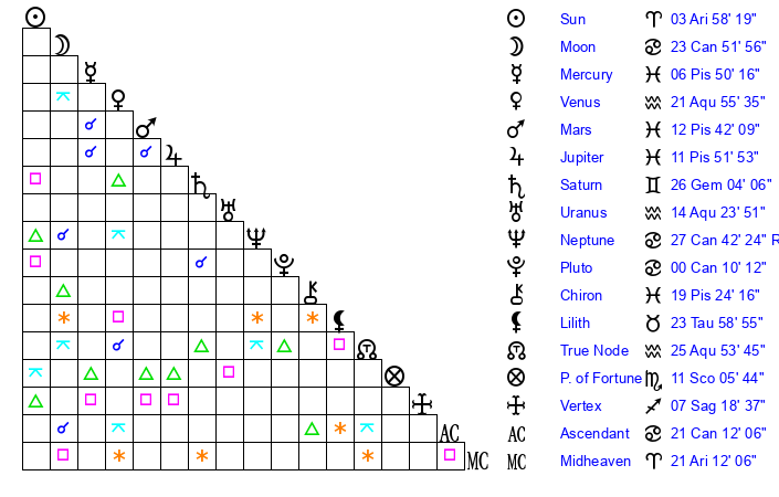 | Mars | 12 Pisces 42 | 21 Cancer 40 | 5 Gemini 14 |