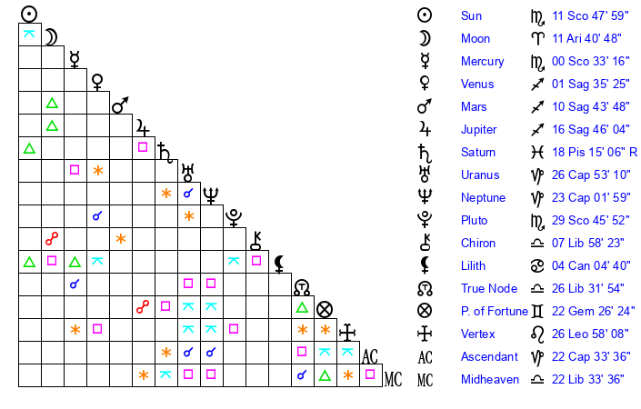 Sun | 11 Scorpio 48 | 12 Scorpio 46 | 11 Sagittarius 3 |