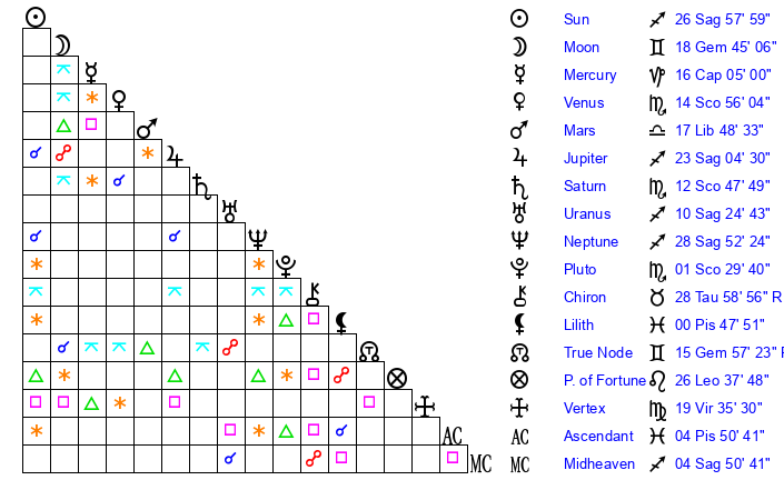 | Sun | 26 Sagittarius 58 | 28 Sagittarius 2 | 8 Aquarius 43 |