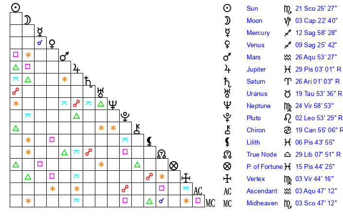 | Sun | 21 Scorpio 25 | 22 Scorpio 34 | 18 Aquarius 48 |
