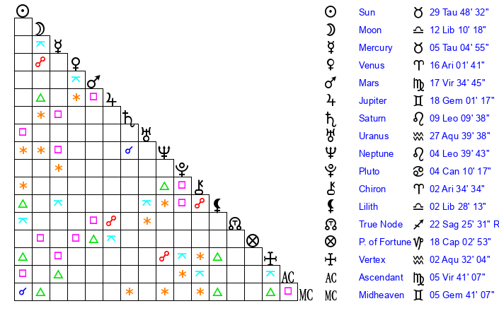 | Sun | 29 Taurus 48 | 0 Gemini 53 | 12 Virgo 18 |