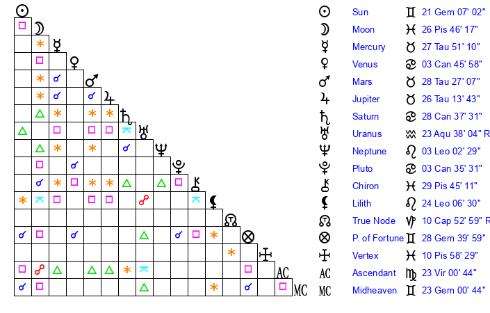| Sun | 21 Gemini 7 | 21 Gemini 58 | 4 Libra 59 |