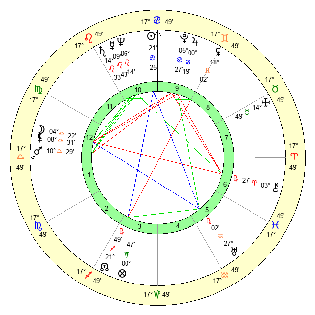 | Sun | 21 Cancer 24 | 22 Cancer 30 | 5 Scorpio 28 |