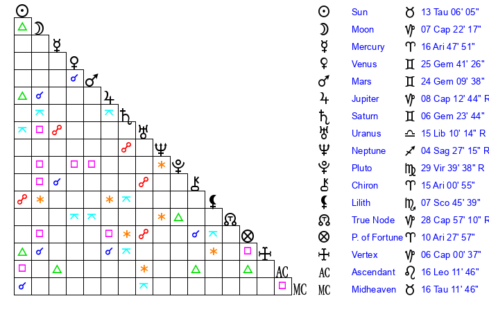 | Venus | 25 Gemini 41 | 1 Aries 36 | 21 Gemini 53 |