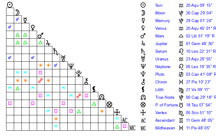 | Sun | 20 Aquarius 9 | 21 Aquarius 12 | 5 Gemini 34 |