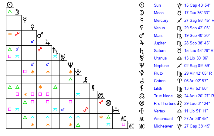 | Saturn | 16 Taurus 4 | 14 Pisces 55 | 17 Taurus 37 |