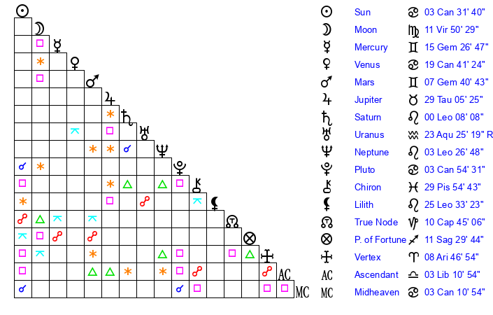 | Moon | 11 Virgo 46 | 8 Cancer 1 | 29 Leo 15 |