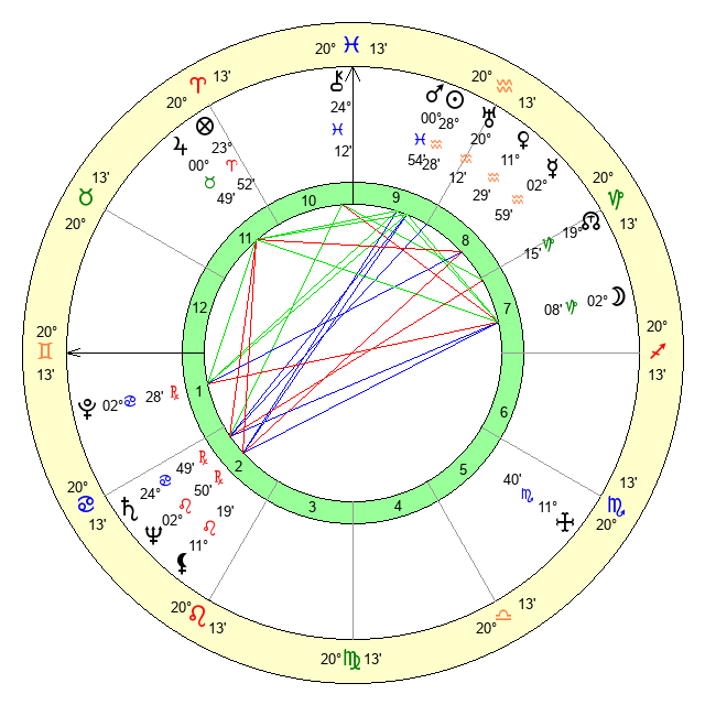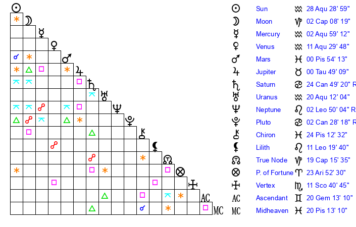 | Sun | 28 Aquarius 29 | 29 Aquarius 17 | 14 Gemini 25 |