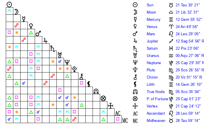 Sun | 21 Taurus 30 | 22 Taurus 13 | 20 Gemini 18 |