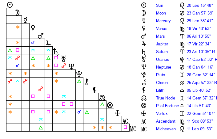 | Sun | 20 Leo 16 | 21 Leo 12 | 14 Sagittarius 59 |