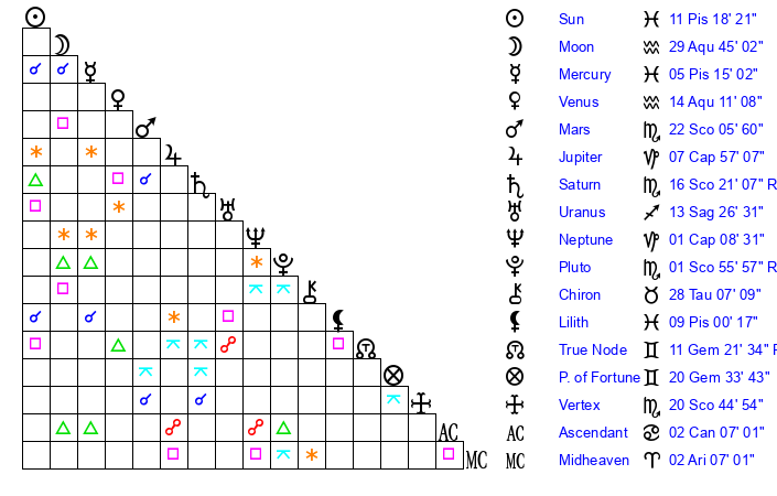 | Pluto | 1 Scorpio 55 | 2 Aquarius 54 | 0 Scorpio 59 |