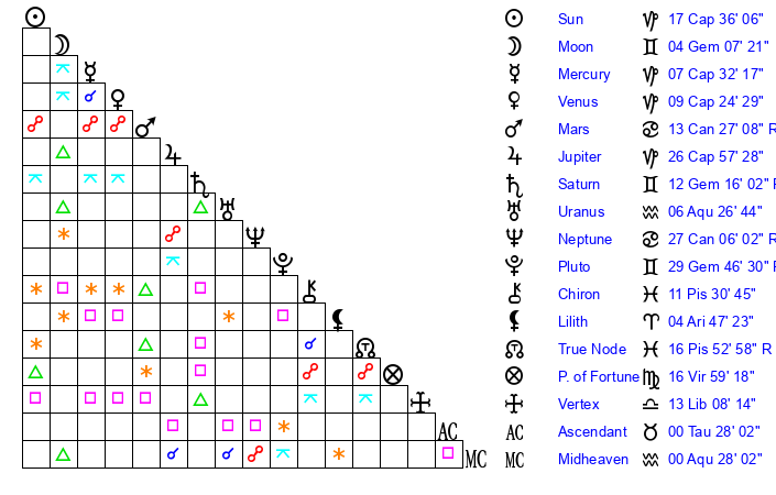 | Pluto | 29 Gemini 46 | 2 Aquarius 57 | 29 Gemini 29 |