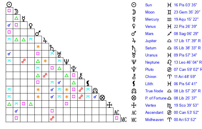 | Sun | 16 Pisces 3 | 17 Pisces 5 | 26 Gemini 22 |