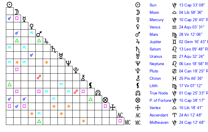 | Mars | 28 Virgo 12 | 15 Capricorn 32 | 13 Virgo 54 |