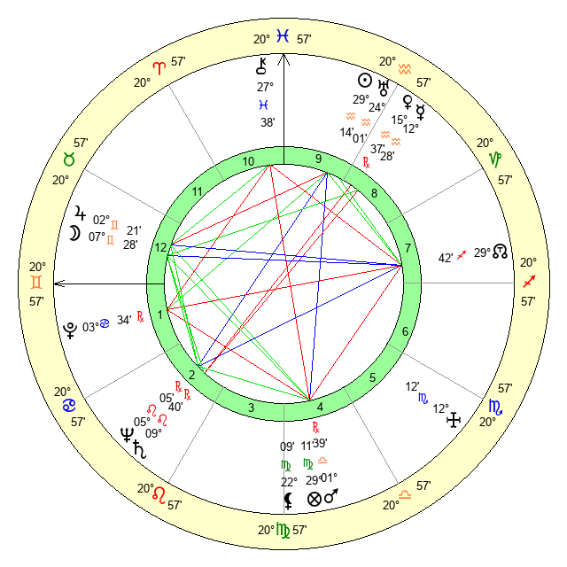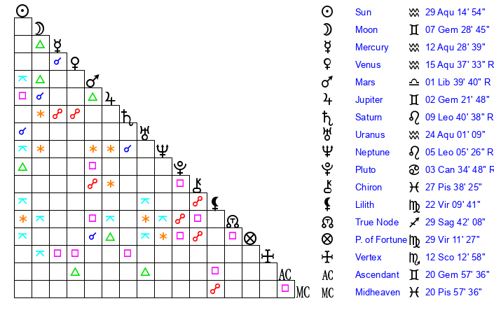 | Sun | 29 Aquarius 15 | 0 Pisces 17 | 14 Gemini 11 |