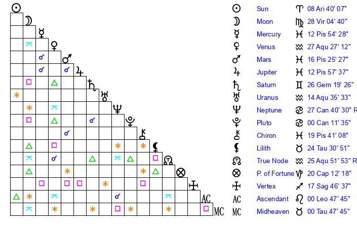 | Sun | 8 Aries 40 | 10 Aries 0 | 24 Cancer 43 |