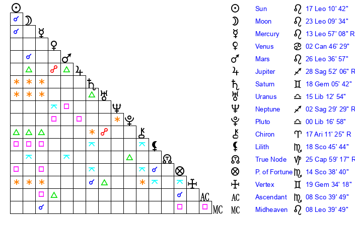 | Mercury | 13 Leo 56 | 4 Leo 23 | 17 Libra 37 |
