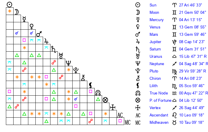 | Sun | 27 Aries 46 | 27 Aries 56 | 18 Gemini 55 |
