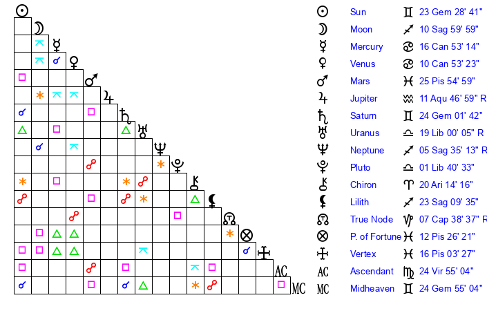 | Saturn | 24 Gemini 18 | 1 Aries 9 | 0 Cancer 42 |