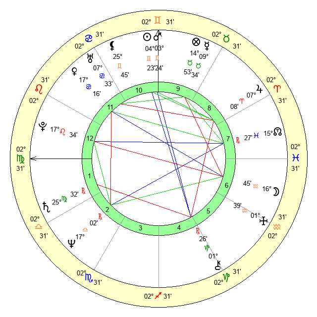 | Sun | 4 Gemini 23 | 5 Gemini 27 | 15 Leo 5 |