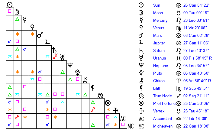 | Sun | 26 Cancer 54 | 28 Cancer 14 | 10 Scorpio 13 |