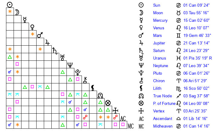| Sun | 1 Cancer 9 | 2 Cancer 29 | 13 Libra 22 |