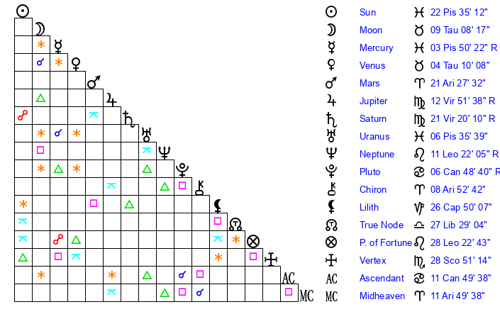 | Moon | 9 Taurus 14 | 16 Virgo 46 | 1 Pisces 52 |