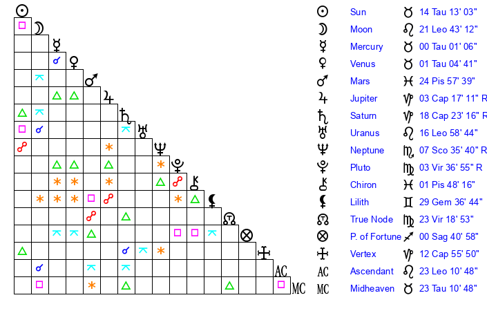 | Moon | 21 Leo 36 | 16 Leo 8 | 14 Capricorn 54 |