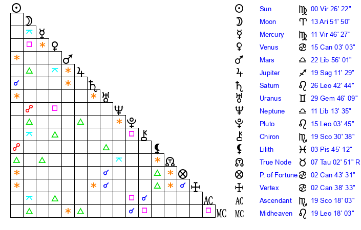 | Sun | 0 Virgo 27 | 0 Virgo 49 | 16 Scorpio 13 |