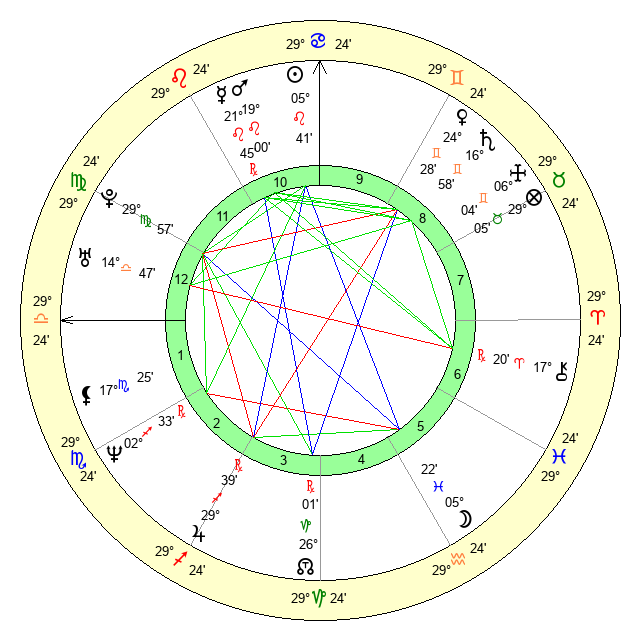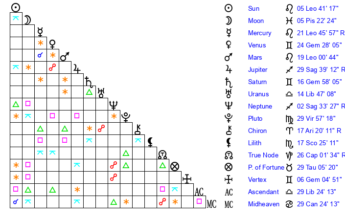 | Moon | 5 Pisces 25 | 23 Virgo 28 | 11 Aquarius 54 |