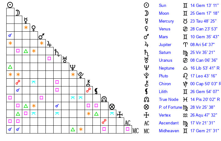 | Sun | 14 Gemini 13 | 15 Gemini 17 | 24 Leo 56 |